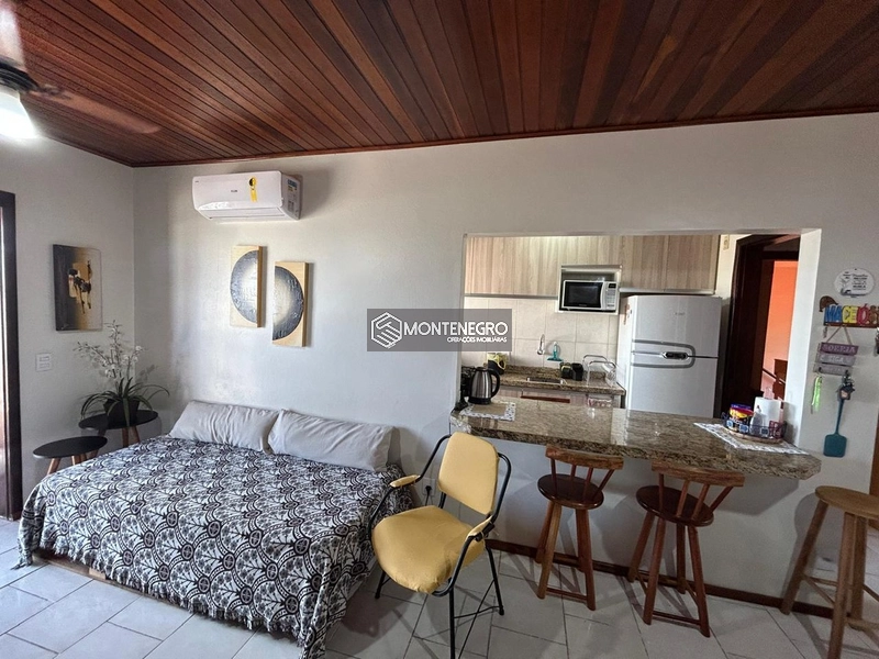 1 dormitorio, sala integrada com cozinha americana, banheiro, area de serviço com churrasqueira e box coberto, mobiliado!!! Piscinas e zeladoria!!!